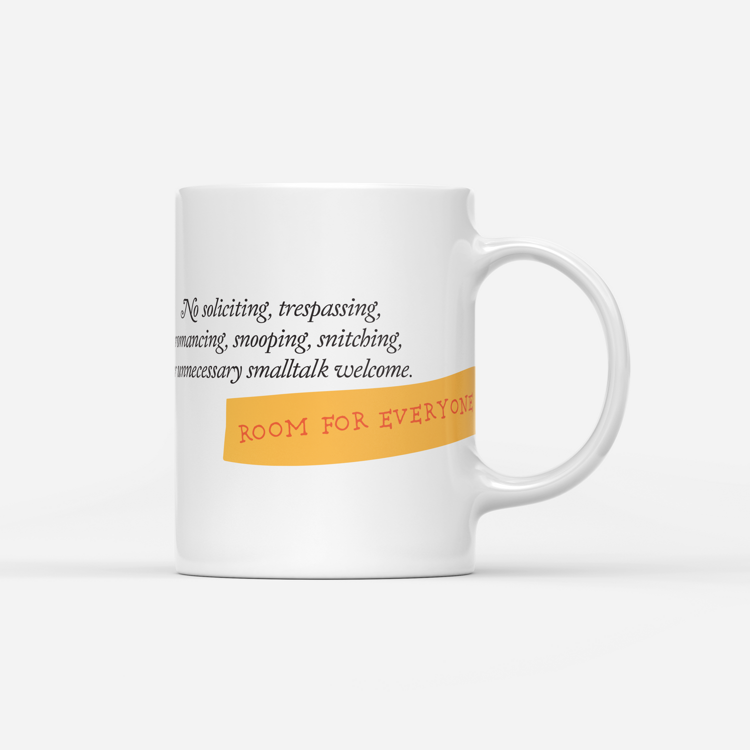 No soliciting, trespassing, romancing, snooping, snitching, or unnecessary smalltalk welcome. Room for everyone.